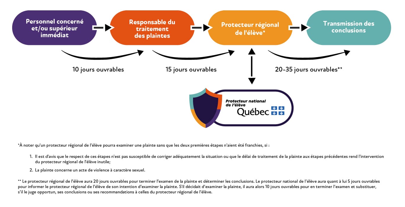 Avant leur transmission, les conclusions sont cependant examinées par le Protecteur national de l’élève, qui dispose pour sa part d’un délai maximal de 5 jours ouvrables pour décider d’examiner lui-même la plainte. Dans cette éventualité, il dispose alors de 10 jours ouvrables pour en terminer l’examen et substituer, au besoin, ses conclusions ou ses recommandations à celles du protecteur régional de l’élève.